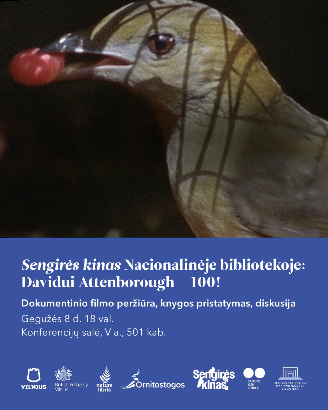 Vakaro metu bus pristatyta ir pirmoji leidyklos „Natura Libris“ knyga – Davido Attenborough „Paukščių gyvenimo paslaptys“, papildysianti renginį dar vienu žvilgsniu į gamtos įvairovę. Tai kvietimas ne tik paminėti legendinio gamtininko jubiliejų, bet ir tapti bendruomenės dalimi, kuriai rūpi gamta, kinas ir prasmingi susitikimai.