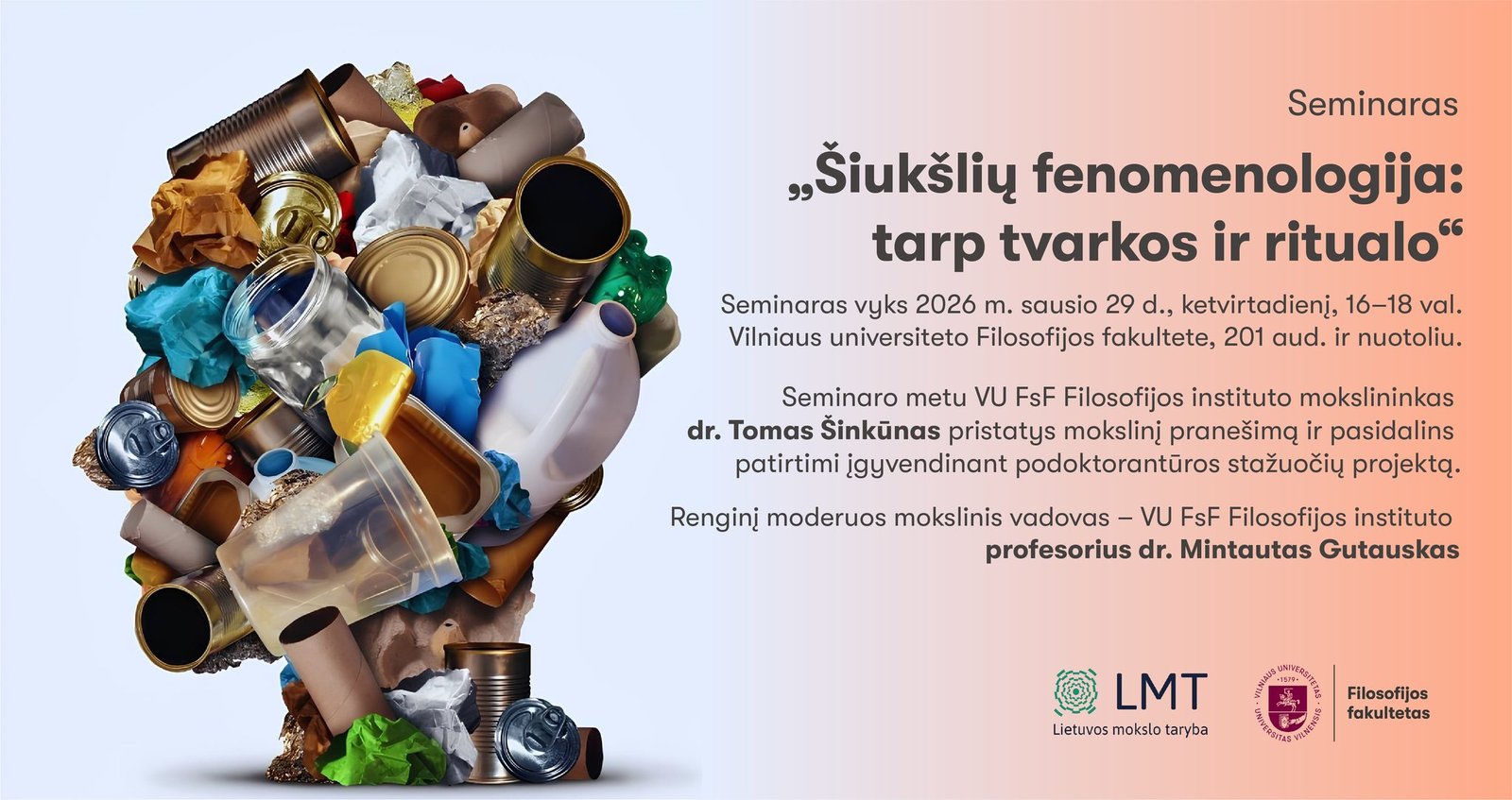 2026 m. sausio 29 d., ketvirtadienį, 16–18 val. kviečiame į mokslinį seminarą „Šiukšlių fenomenologija: tarp tvarkos ir ritualo“ Vilniaus universiteto Filosofijos fakultete, 201 aud., ir nuotoliu.