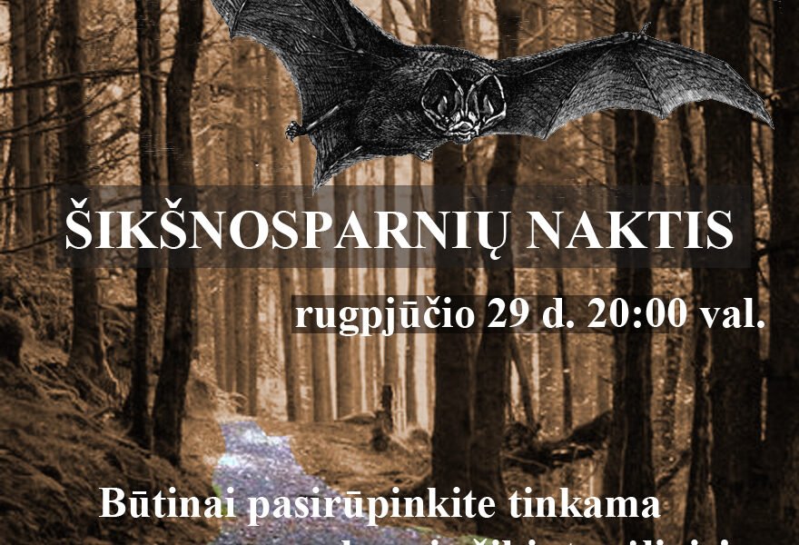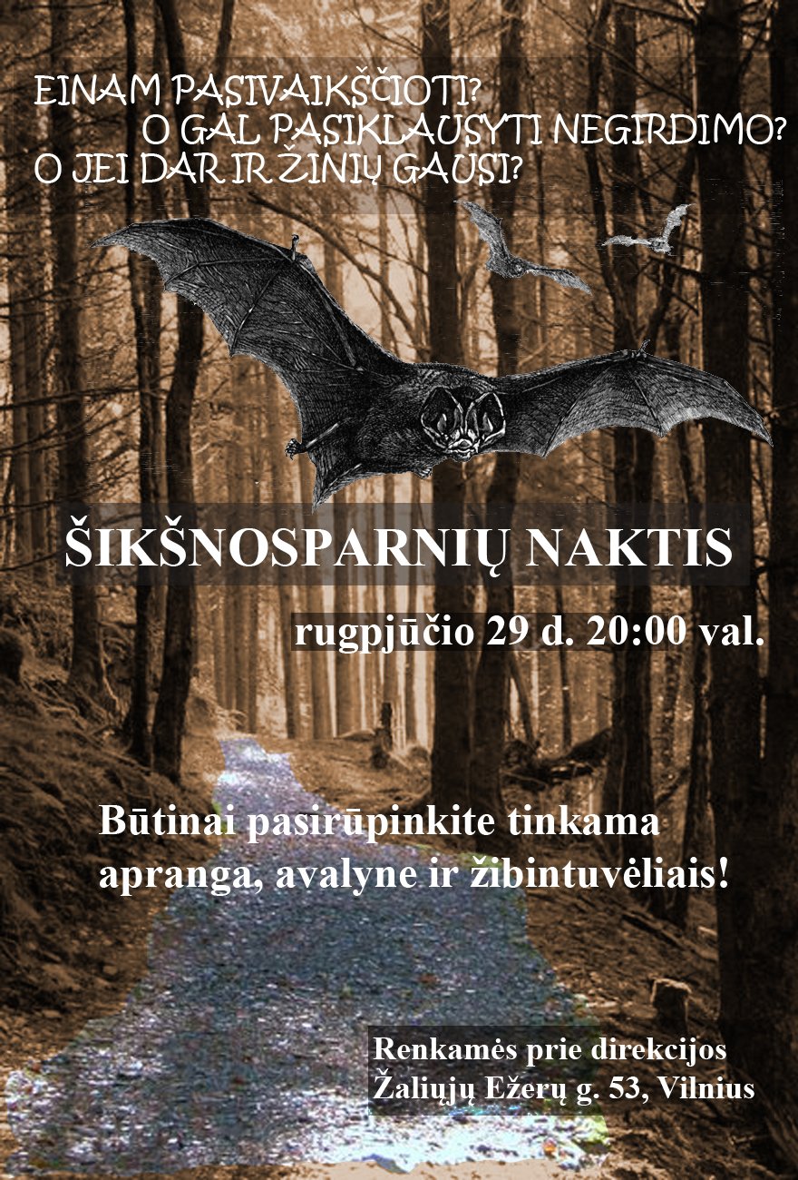 Kviečiami visus, norinčius pasivaikščioti po Ežerėlių geomorfologinį draustinį Verkių regioniniame parke ir sužinoti apie vienus labiausiai mitais apipintus ir paslaptingus gyvūnus – šikšnosparnius. Sužinosimeapie jų gyvenimo būdą, kuo minta, bandysime išgirsti šikšnosparnių „balsus”. Keliausime kartu su šikšnosparnių ekspertu Remigijumi Karpuška. Nepamirškite pasirūpinti tinkama apranga, avalyne, bei žibintuvėliais.