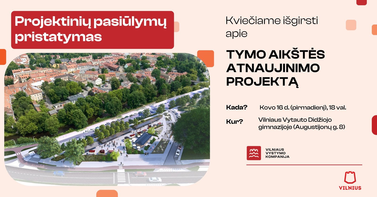 🌐 Su trumpu sprendinių aprašymu ir išsamia projektinių pasiūlymų byla galima susipažinti projekto polapyje: https://pasitarkime.vilnius.lt/projects/tymo-aikste