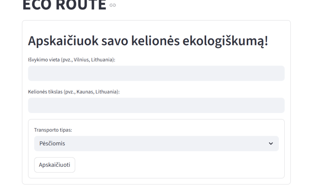 ECO ROUTE - tai mūsų sukurta svetainė, kuri padeda nustatyti ekologinį pėdsaką, susijusį su transporto naudojimu.